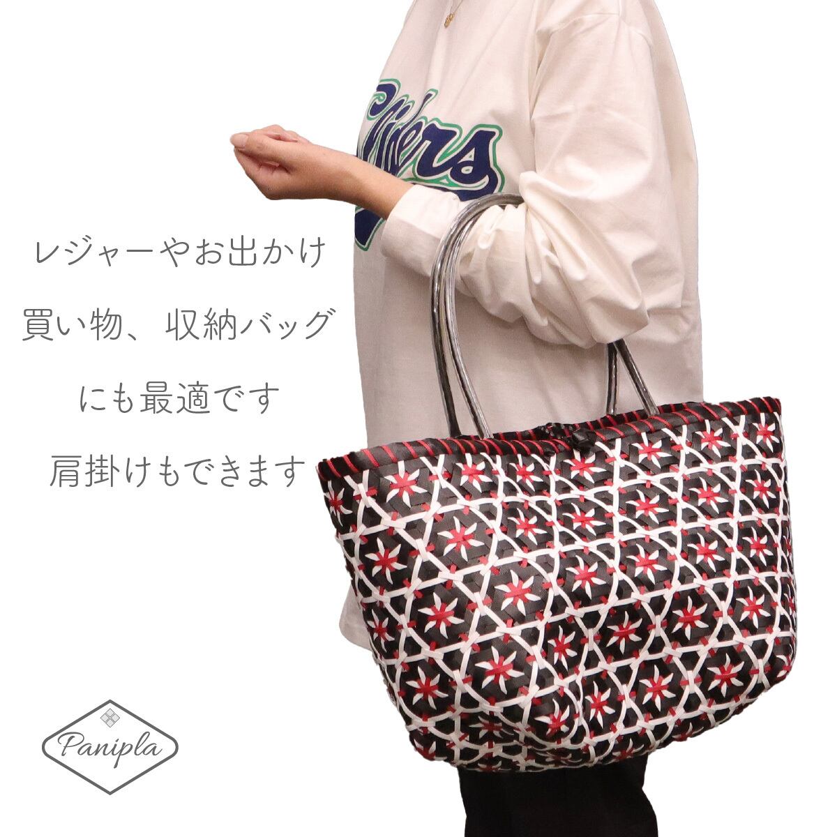 ブラックベースにホワイトとレッドの花柄カゴバックです。