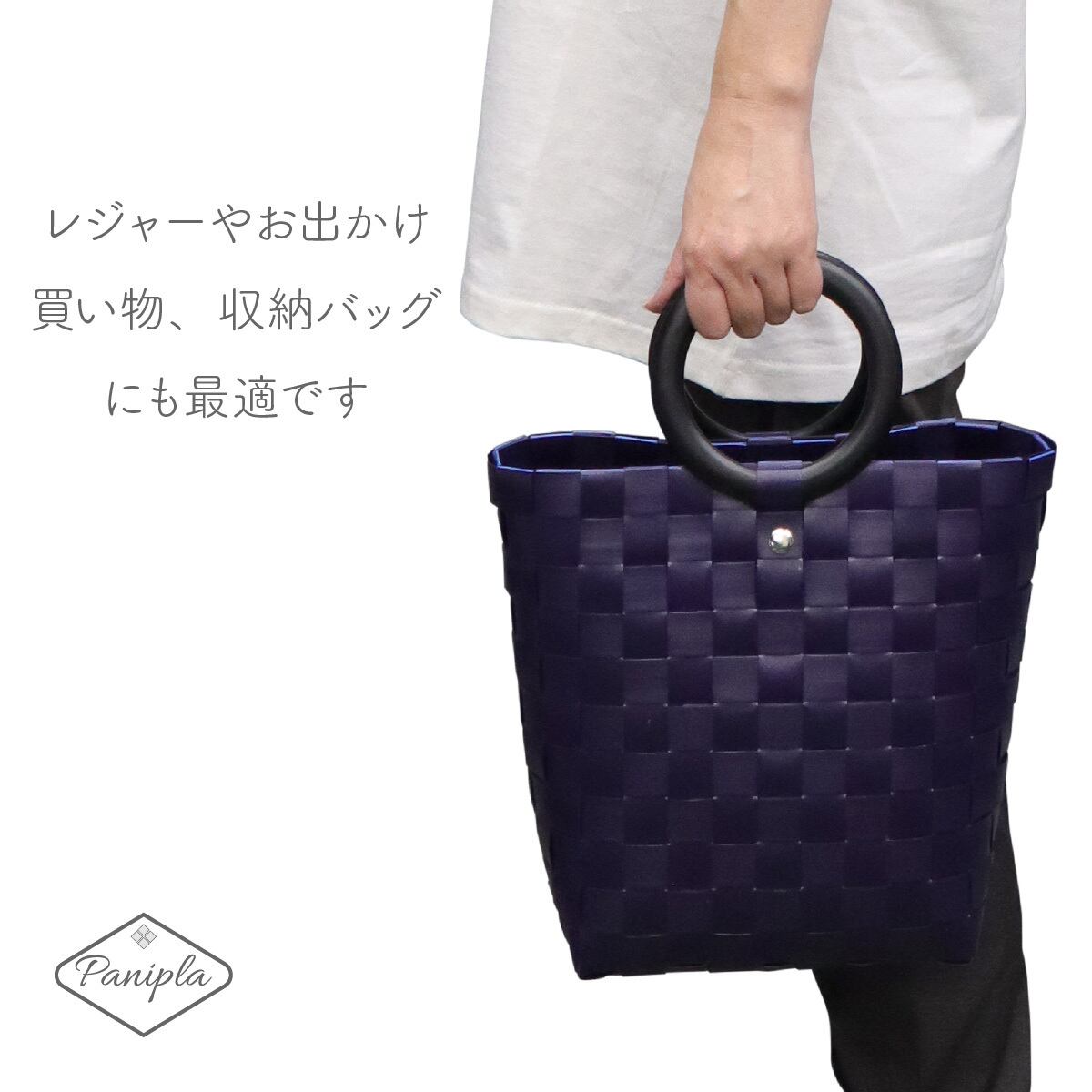 太めの紫がかったパープルネイビーのテープでさいの目状に編んである、シンプルなカゴバックです。